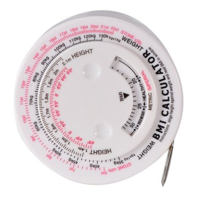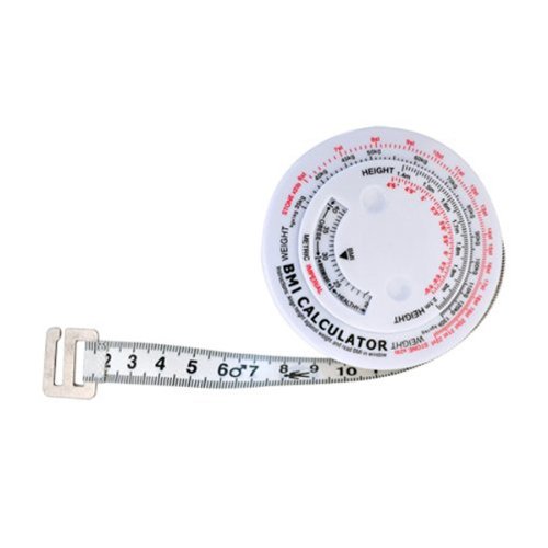 -. Binding : Electronics -. Brand : Thumbupshop -. EAN : 0757536774492 -. Feature : ABS plastic(case)+PVC (tape) Tape: 0-1500mm Size: 7.3 x 7.3 x 2.3cm / Turn the middle plate according to the personal height and weight / Once the height turn to the different weight, BMI will show healthy, over weight, obese, underweight. / Use the tape to measure the waist. -. Label : Thailand -. Manufacturer : Thailand -. ProductGroup : Office Product -. ProductTypeName : CALCULATOR -. Publisher : Thailand -. Studio : Thailand -. Title : Accurate Health BMI Calculator Body Measure Tape-round -. UPC : 757536774492