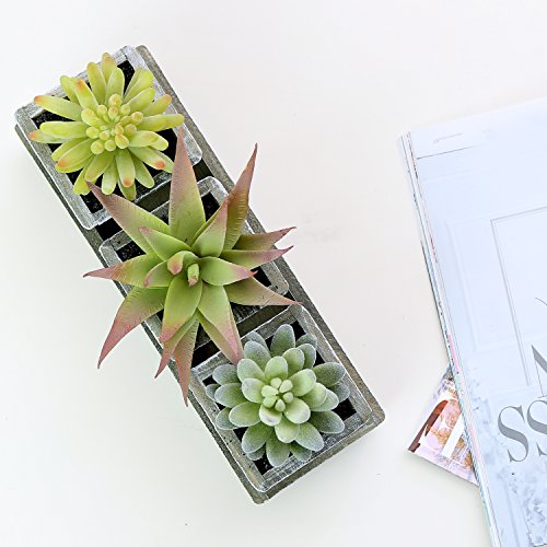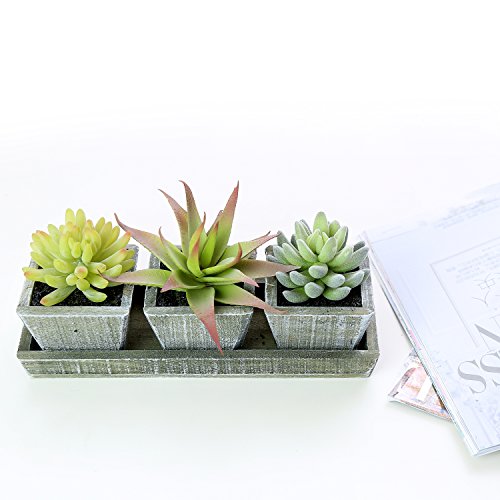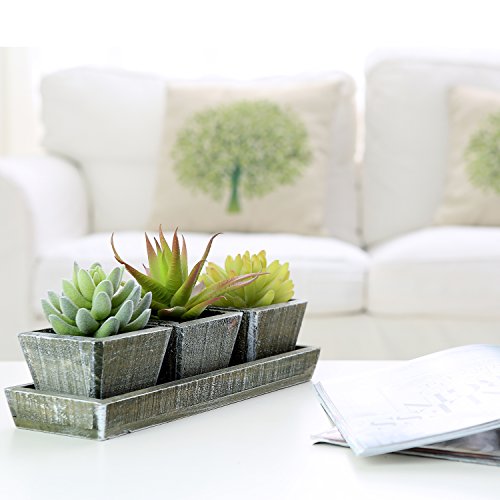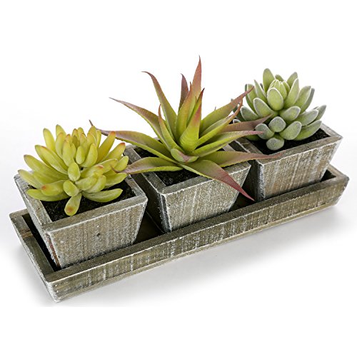 Set of 3 Life-Like Mixed Artificial Succulent Plants in Country Rustic Wooden Square Pots & Display Tray