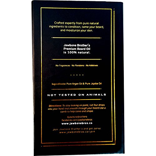 Smooth and condition your beard with Jawbone Brother's 100% Natural Beard Oil containing pure Jojoba and Argan Oil crafted specifically to moisturize dry skin, soften and tame the beard, and promote healthy beard growth. There are no added chemicals, preservatives, fragrances or colors and its not tested on animals so you know its good.✔ Crafted from a 50% - 50% blend of the finest Argan and Jojoba Oil, specifically designed to stop bearddruff and formulated to moisturize the skin.