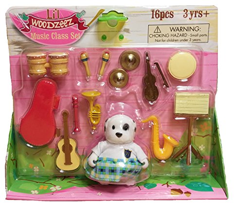 -. Feature : NEW! Woodzeez Music Class Mini Playset 16 Pcs - New Collectible 2016 from Woodzeez / This set includes: 1 dog character, 1 outift, 1 guitarcase, 1 guitar, 1 violin, 1 violin bow, 1 bongo set, 1 saxophone, 1 tamborine, 1 music stand, 2 maracas, 1 recorder, 1 trumpet, and 2 symbols. / Including Ruby Woofwinkle / 16 Pcs / For age 3 yrs and up