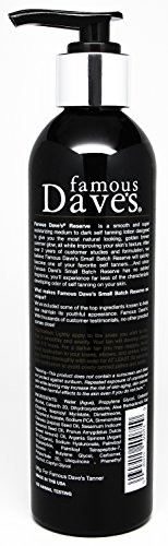 Famous Dave's Small Batch Reserve self tanner is a creamy and smooth light to medium sunless tanning lotion that has been field tested and has received rave reviews from many of our most loyal customers as well as beauty bloggers from around the world. Our goal was to make the silkiest, most moisturizing, golden self tanner available anywhere. Because we manufacture Famous Dave's Small Batch Reserve self tanning lotion in smaller batch sizes, don't expect to find our tanner in your big box stores anytime soon...although you may find it in luxury boutiques, gift stores, and salons.
