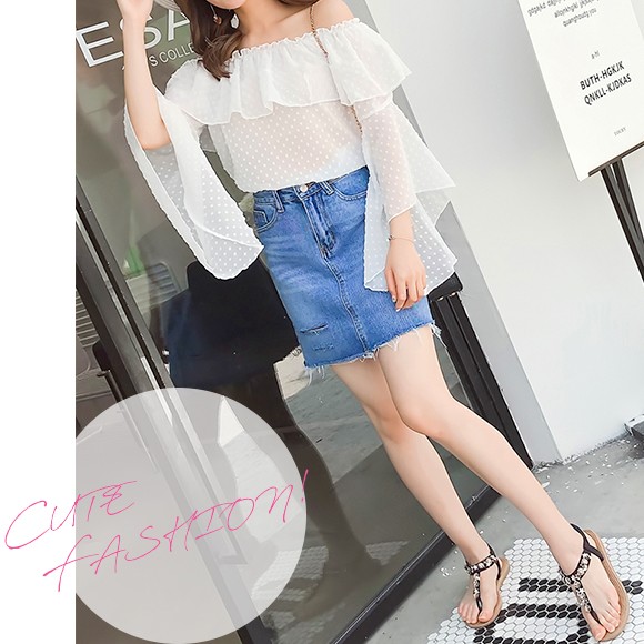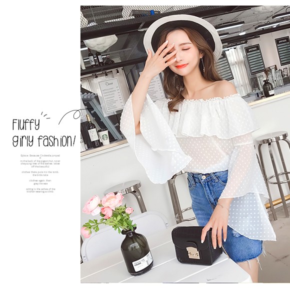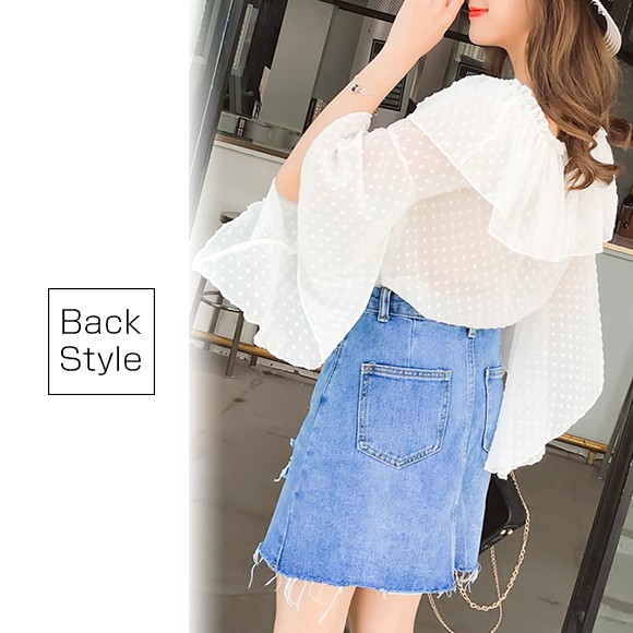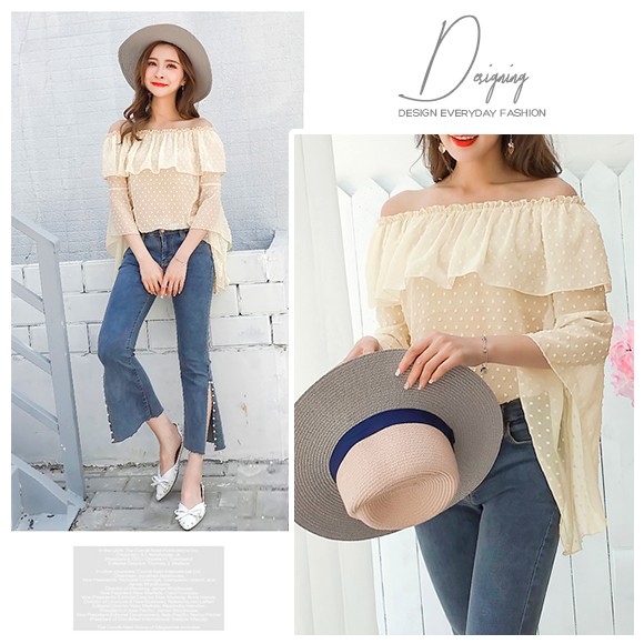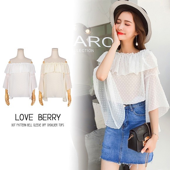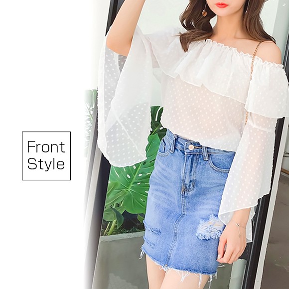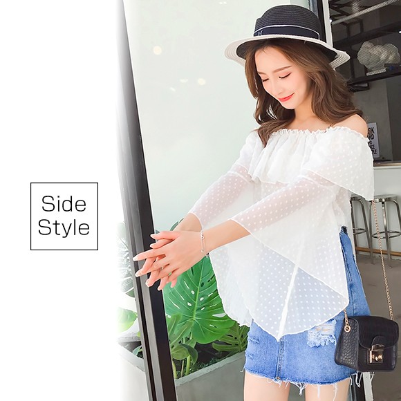透け感のあるシフォン素材が涼し気なベルスリーブのオフショルトップスです☆