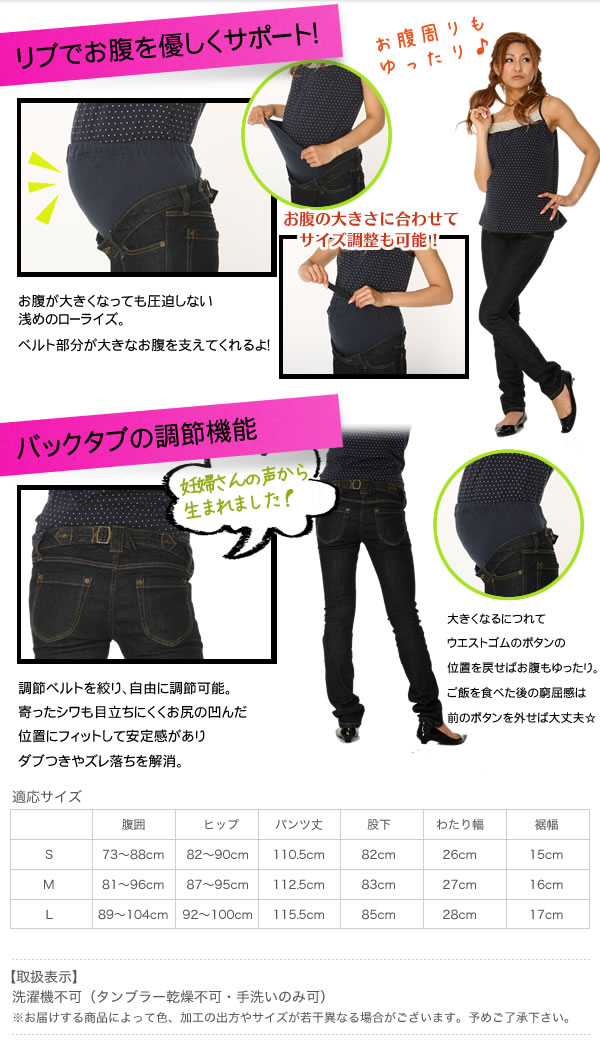 リブ付きでお腹をサポートしてくれるから安心のスキニーデニム。濃い目のインディゴカラーはキレイめカジュアルスタイルには欠かせない!美脚効果もあり伸縮性もあるから妊婦ママも安心☆