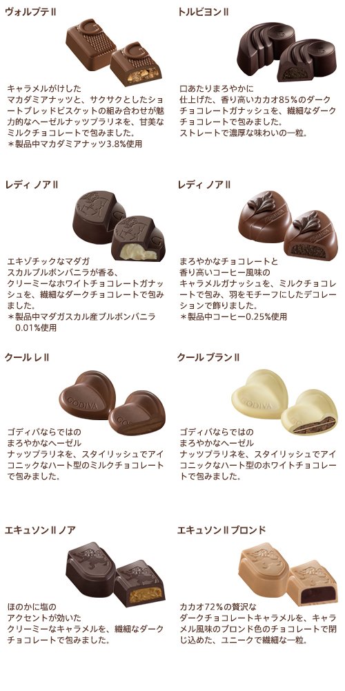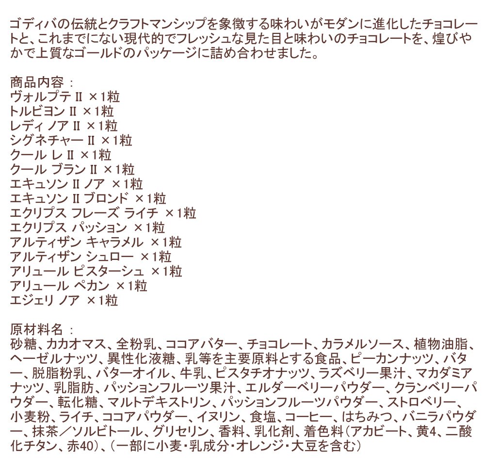 ゴディバの伝統とクラフトマンシップを象徴する味わいがモダンに進化したチョコレートと、これまでにない現代的でフレッシュな見た目と味わいのチョコレートを、煌びやかで上質なゴールドのパッケージに詰め合わせました。