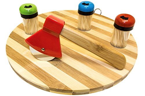 BUNDLE INGREDIENTS: (1) 13" Round Bamboo Cutting Board (1) 'The Axe' Pizza Cutter Knife (3) Color Coded ToothPick Holders w Toothpicks