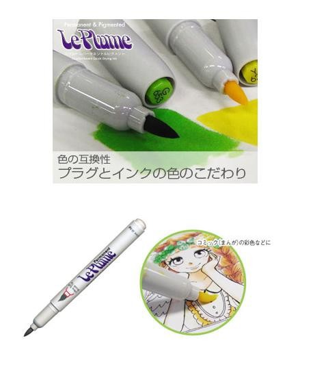 ペン先はソフトでしなやかなシングルヘッド筆タイプで、色塗りもムラになりにくく、細い線もきれいに描けます。アルコールインクはコピーのトナーを溶かさないので元の線画をストックできます。また、インクの伸びがよい、発色が美しい、重ね塗りしても色がにごりにくいという特徴を備えています。 |