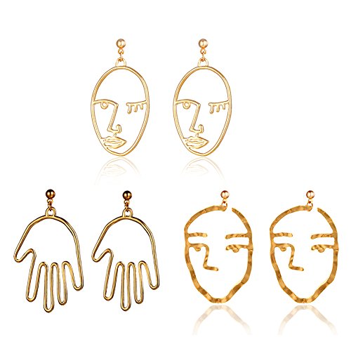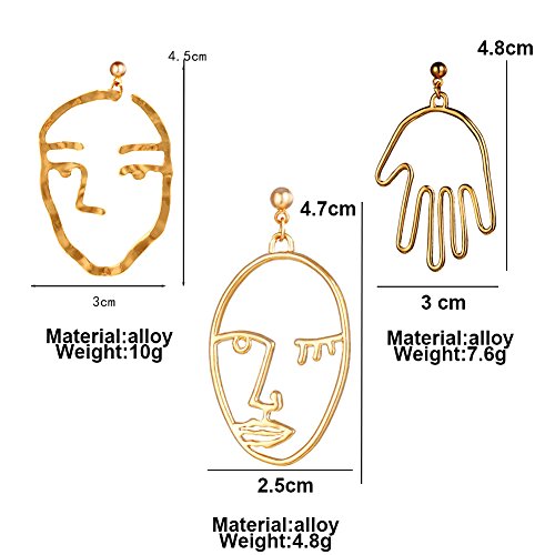 WHAT YOU WILL GET :3 pair gold hollow earrings include 2 pair human face Design dangle earrings and 1 pair hand earrings.