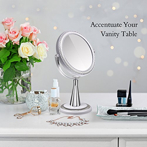 Frustrated by face mirrors that don’t have the real estate you need to apply your make up stress-free? You’ll enjoy the flexible 360-degree swivel switch on this white and chrome-plated beauty mirror with two 6-inch cosmetic mirror that give you the perfect lens for all your beauty needs.