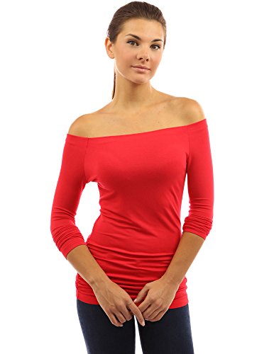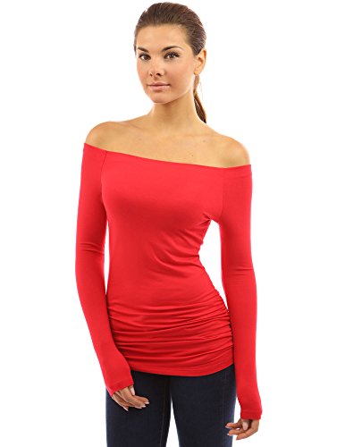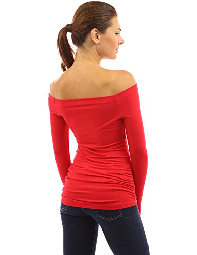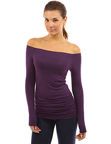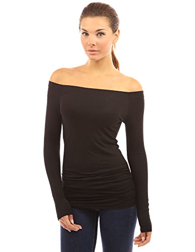 PattyBoutik Off Shoulder Ruched Sides Raglan Long Sleeve Blouse. Model in pictures is 5 feet 8 inches (173cm) tall wearing size S.