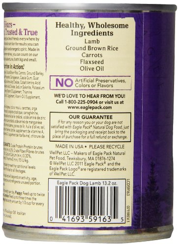 Eagle Pack Natural Wet Canned Dog Food Lamb Formula is a balanced diet for dogs of all sizes, breeds and life stages. Fortified with healthy, whole ingredients, protein, vitamins and minerals, Eagle Pack natural wet canned dog food is ideal to feed as a complete meal or as a topper or mixer in addition to a dry dog food diet.