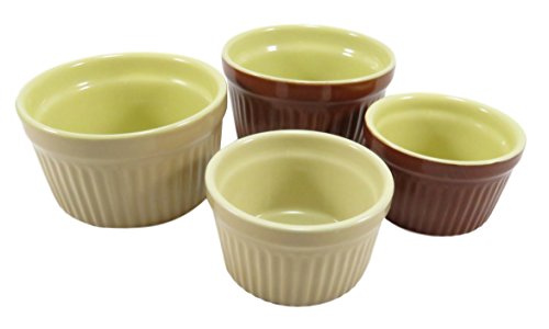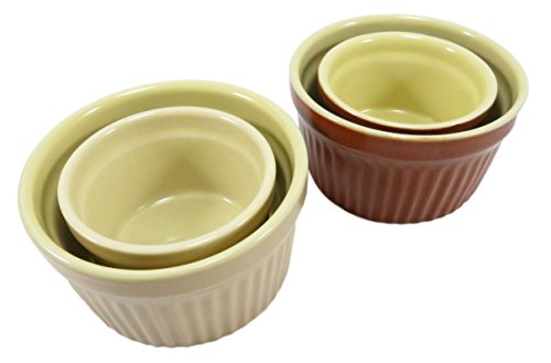 THE SPECIFICS: Set of 4 round ramekins made of ceramic (3.4" x 3.4" - small); (2.6" x 2.6" - mini); in brown and beige. These are oven, microwave, and dishwasher safe.