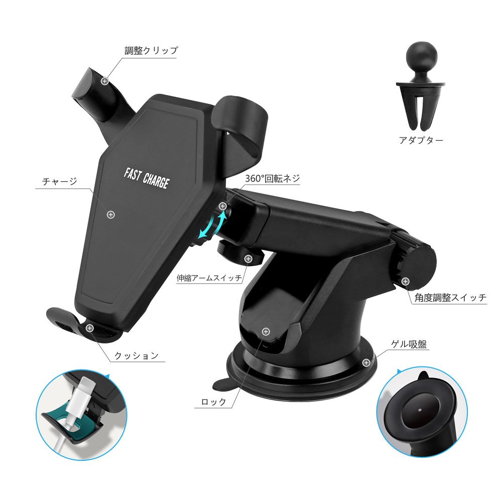 Wireless charger main unit X 1, air conditioning blowing connector X 1, sucker type stand X 1, USB cable X 1, manual X 1