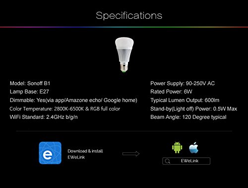 - No Hub Required – Connect the bulb directly to your Wi-Fi at home Manage Remotely – Control your lights from anywhere with your tablet or smartphone the free eWeLink app (iOS, Android) Color Changing – Fine-tune colors for every occasion and adjust brightness as well as light appearance from soft white (2800k) to daylight (6500k)