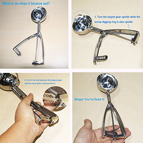 DO NOT USE ON HARD THINGS --Like sub-zero ice cream. Use the trigger ice cream scoop for cookies, meatloaf, watermelon and other things like that, and they will last a lifetime. ★ TIPS-Because It's trigger scoop, it's normal condition when one side of the handle part bounce out, it can return to the original position like the 7th picuture there.