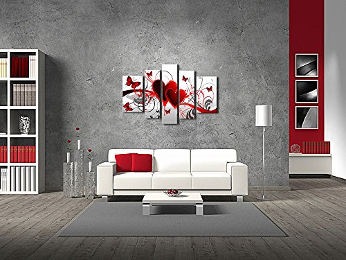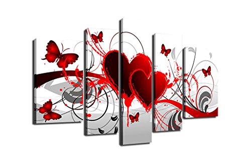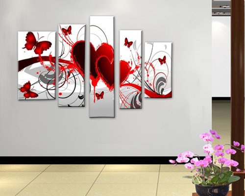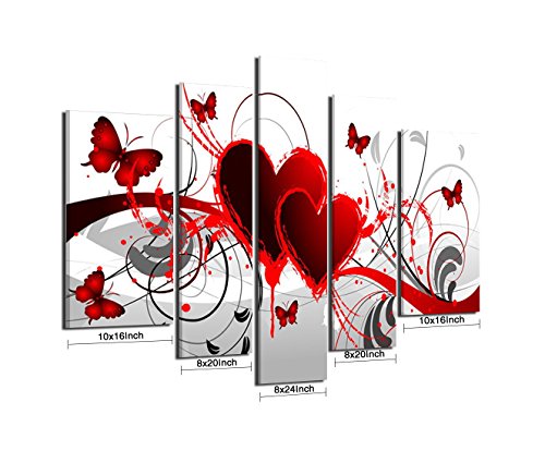 -. Title : Ode-Rin - 100% Hand Painted Oil Painting on Canvas Red Heart Butterfly Wood Framed and Stretched 5 Pieces Hot Love Wall Art Painting for Living Room Office Kitchen Bedroom Home Decor, Ready to Hang
