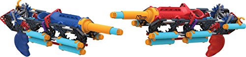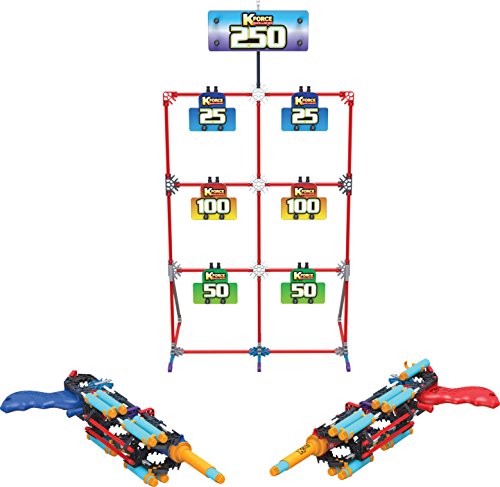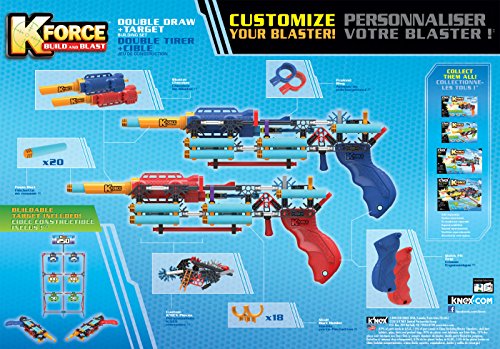 Build 2 blasters and a target at the same time in this 365 piece set! The Double Draw blasters each fire up to 75 feet! Set includes K'NEX rods and connectors plus special parts to create customized blasters: 2 blaster chambers, 8 skull dart holders, 2 quick fit grips, 2 preload rings and 20 foam darts. In addition to the Double Draw and Target builds, you can download instructions for 2 more alternate blasters and buildable targets for added fun. Compatible with the entire K-FORCE Build and Blast line. All K'NEX parts and pieces are guaranteed for a lifetime of fun and all K'NEX bricks, rods, and connectors proudly made in the USA. This set is perfect for builders ages 8 and up.Feature