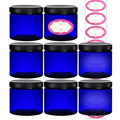 DilaBee 8-Pack 16 Ounce Cobalt Blue Refillable Clear Plastic Cosmetic Jars with Lids and Labels, Round Containers For Beauty Products, Cream, Exfoliating...