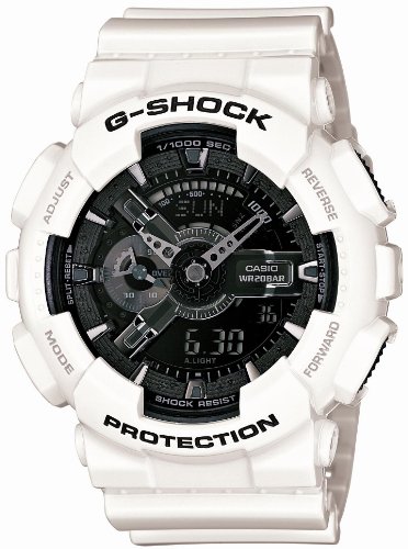 [G-SHOCK White and Black Series] to pursue toughness evolving G-SHOCK from New color series "White & Black Series" appeared. The base model rugged toughness design is adopted the model of the popular analog big case. Big case model has adopted a brilliant white in its powerful modeling. Sneakers and casual accessories also be incorporated such as in industrial products the monotone and high contrast that has also become a design trend was represented by a white and black shiny. In addition the accent of the index and the hour and minute hands of metallic silver and finished with a cool design. Whole body gives off a brilliant shine is a model that shine in the street casual scene. ? JIS1 species antimagnetic performance and speed measurement function ● Shock structure ● anti-magnetic watch (JIS1 species) ● 20 atmospheric pressure waterproof function ● World Time 48 cities (29 time zones daylight saving time setting function) + time display of UTC (Coordinated Universal Time) Home time of the city features replacement ● stopwatch 1/1000 seconds a total of 100 hours speed measurement function (MAX1998unit / h 2unit / h units) lap / split measurement switching ● timer set: 1 minute set up: 24 hours measured in seconds auto repeat ● alarm clock strikes five alarm: 1 only with snooze function ● full automatic calendar ● 12/24 hour display switching ● LED light auto light function afterglow function switching afterglow time ( 1.5 seconds / 3 seconds) with ● battery life: about 2 years / [domestic regular goods] ※ the battery that is built into the watch is a monitor battery for verifying operation.