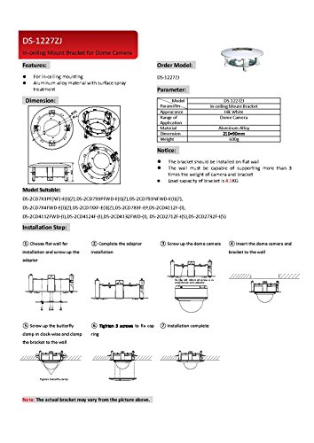 -. Feature : For in-ceiling mounting. / Aluminum alloy material with surface spray treatment / Load capacity of mount is 4.5KG / Compatible with the following cameras: DS-2CD41xxF(WD)-(I), DS-2CD783F-EP, DS-2CD793NFWD-E(I)(Z), DS-2CD793PFWD-E(I)(Z) DS-2CD753F-E(I)(Z), DS-2CD7x3PF(NF)-E(I)(Z), DS-2CD7xxF-E(I)(Z), DS-2CD7x4FWD-E(I)(Z), DS-2CD27x2FWD-I(Z)(S), DS-2CD27xxF-I(S), NV743MFS(H), NC30x-VD(A)(Z), CMIP72x3(W)-S(Z), CMIP3233-S