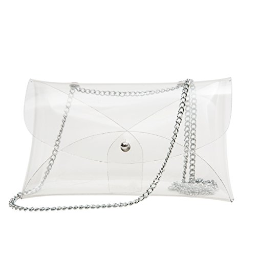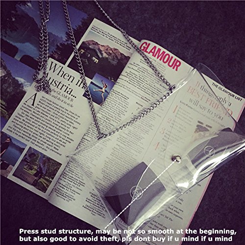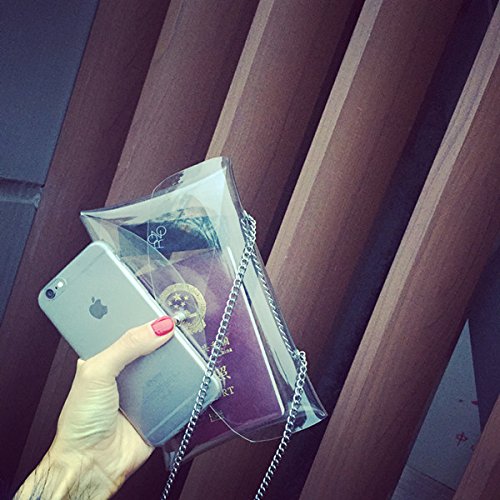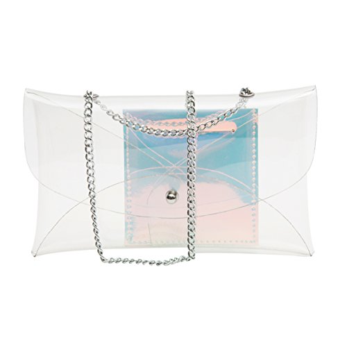 Product Description Clear transparent bag is on trend now. This compact design transparent bag is great for summer use, can fit I phone 6 plus.Pls note inner hologram bag is optional. We have gold chain and silver chain, will send in random if not specified.We offer personalized letter option, max 3 letters. Make your own signature clear bag.Material: clear PVC.Dimension: around 19x 12cm 0