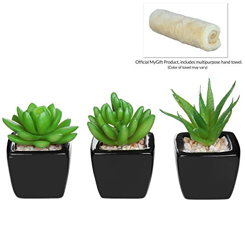 -. Binding : Kitchen -. Brand : MyGift -. Color : Black -. EAN : 0885365491119 -. Feature : Set of 3 mini, artificial succulent plants for your home or office. / Beautiful polished black ceramic pots complements any home or office decorations. / Natural-looking, life-like design. / **Official MyGift® product includes multipurpose cleaning towel.** / Approximate Dimensions: Rounded Leaf Plant - 2.5" W X 2.75" H X 2.25" D; Elongated Leaf Plant - 2.5" W X 3" H X 2.5" D; Pointed Leaf Plant - 3.5" W X 3.25" H X 3.5" D. -. Label : MyGift -. Manufacturer : MyGift -. MPN : TB-DECO0189BLK -. NumberOfItems : 3 -. PartNumber : TB-DECO0189BLK -. ProductGroup : Home -. ProductTypeName : HOME -. Publisher : MyGift -. Studio : MyGift -. Title : Set of 3 Modern Home Decor Mini Succulent Artificial Plants with Square Black Ceramic Pots - MyGift® -. UPC : 887702195919