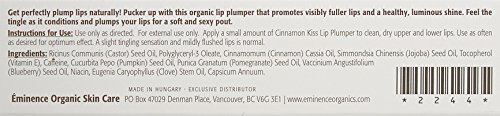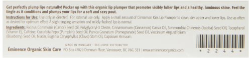 Studio : Eminence Organic Skin Care Publisher : Eminence Organic Skin Care Binding : Misc. Product Description Eminence OrganicsCinnamon Kiss Lip Plumper(0.25 oz)Benefits Increases circulation in the lips Lightweight lip gloss Features Cinnamon Oil promotes circulation and has antiseptic properties Pomegranate Oil improves elasticity, soothes and moisturizes lipsEminence Organics is a highly effective, entirely organic skin care line. With all naturally organic ingredients these hand-made products are effective and extremely healing. Rich in vitamins, active ingredients and nutrients, Eminence products will give you immediate results that you will see and feel.