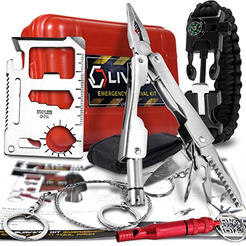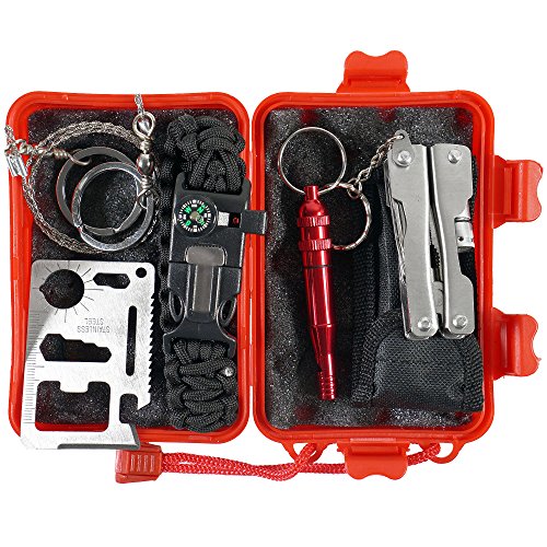 - Portable waterproof zipper tool case, inside is everything you need to help you survive: fire starter, knife, compass, whistle, saw, multipurpose flash light pliers.