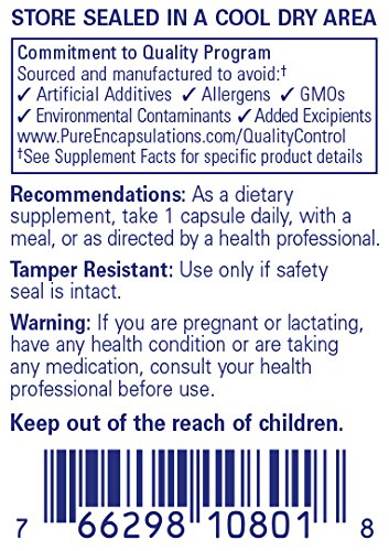 FREE FROM: Pure Encapsulations products are free from wheat, gluten, egg, peanuts, magnesium stearate, hydrogenated fat, artificial sweeteners and colors, and other unnecessary excipients. Any product containing ingredients derived from allergens, such as soy, dairy or shellfish is clearly labeled. * These statements have not been evaluated by the Food and Drug Administration. This product is not intended to diagnose, treat, cure, or prevent any disease.