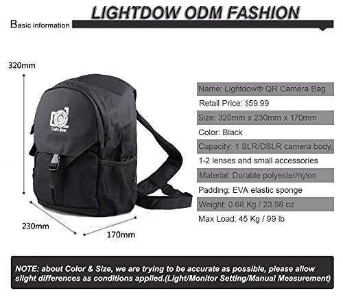 Lightdow® QR camera bag holds and protects 1 SLR/DSLR camera body, 1-2 lenses, and additional small accessories