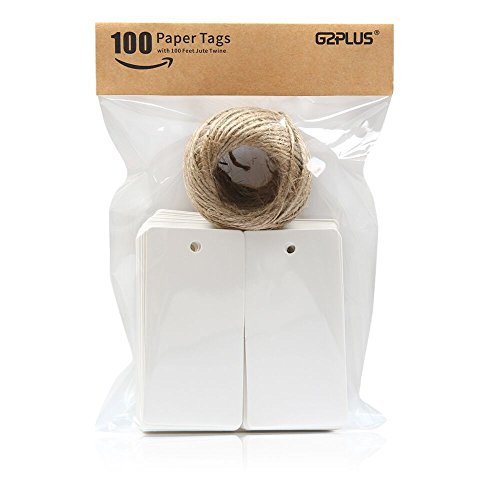 White Gift Tags, G2PLUS 100 PCS Kraft Paper Gift Tag with 100 Feet Jute Twine String, Rectangle Christmas Gift Tags 3.5’’ x 1.7’’ (White)