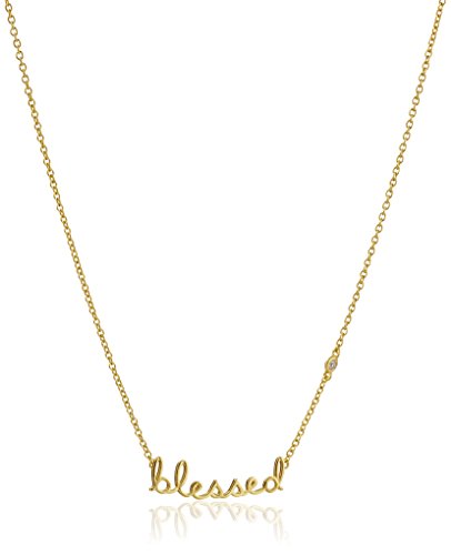 Necklace featuring cursive "blessed" message pendant at center and small bezel-set diamond station