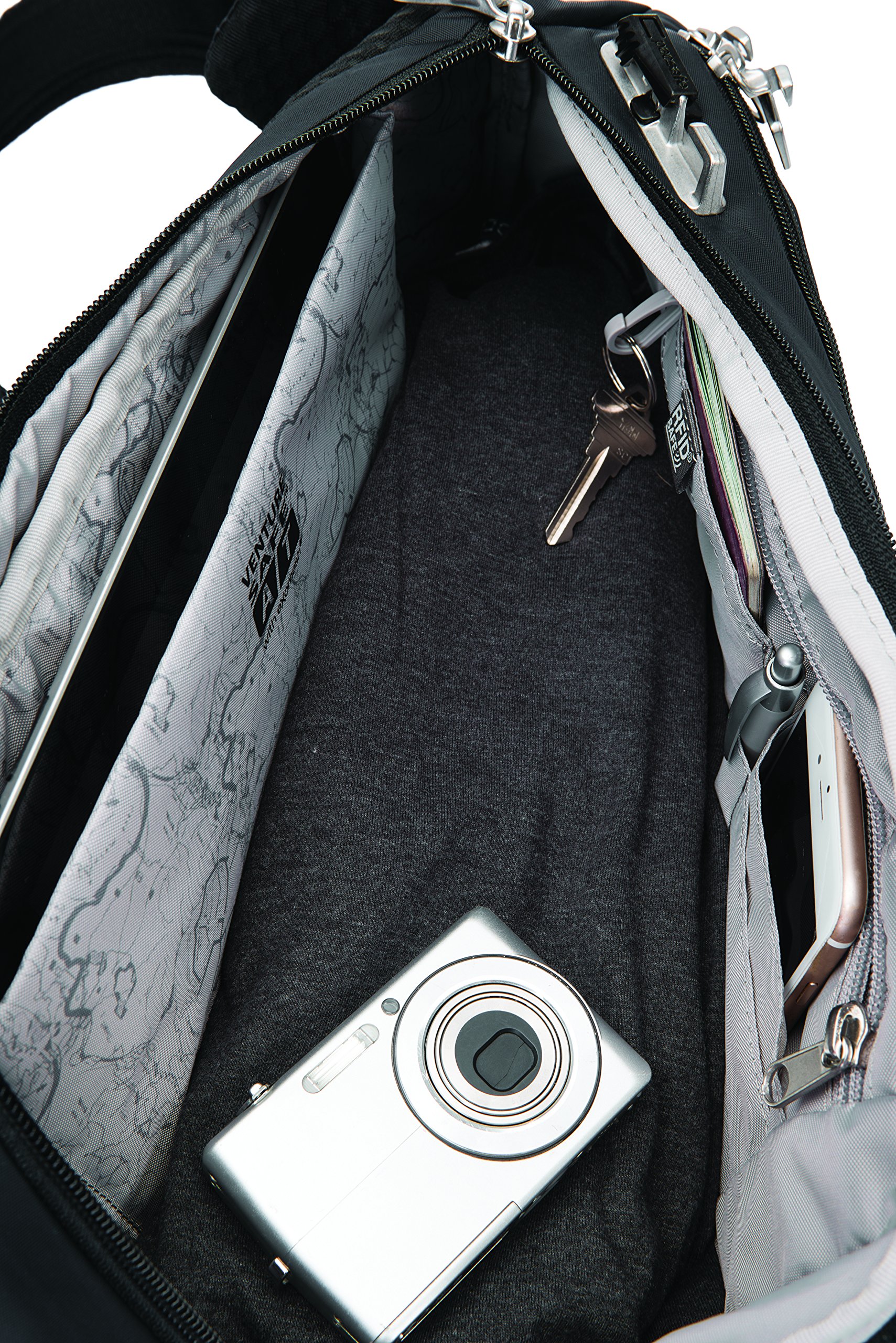 Not only RFIDsafe blocking technology to protect personal information of passports and credit card, eXomesh slash guard & carrysafe to prevent ripping, slash guard strap, Roobar locking system to produce ultimate protection, PopNLock security clip and other anti-theft features.