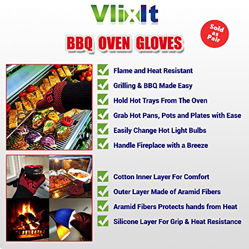- HIGH HEAT RESISTANT - VlixIt Grill Gloves will INSTANTLY protect your hands from EXTREME HEAT AND BURNS from the moment you own your pair. Your grilling mits will not catch flame or melt when exposed to extreme heat or open flames. No worries when cooking, baking, or even setting camp fires.