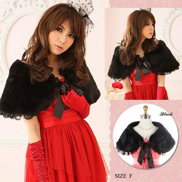 【黒 black ブラック レディース ファー fur ショール ケープ ティペット リボン レース lace 防寒 パーティー ドレス羽織り】