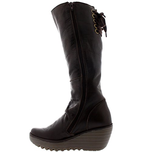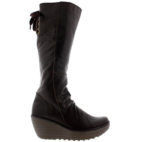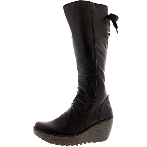 Binding : Apparel Product Description Yust, a knee high boot designed by Fly London. Yust features a smooth leather upper, chunky wedge heel, tooth style tread, Fly London Fly logo on outer heel, contrasting seam stitching, zip fastening on the inner side and a thick lace up closure on the back. 0