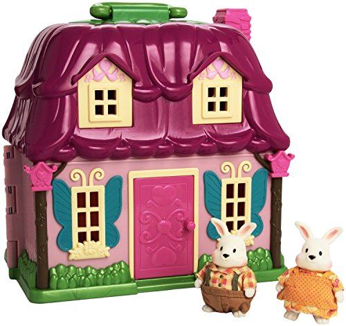 The Li'l Woodzeez Countryside cottage encourages imaginative play and helps develop fine motor skills in children. It comes with a storybook and 2 toy rabbit figures named Amelia and Elliot Hoppingood. These figurines are dressed in soft poly-cotton outfits with a hook and loop closure. The Li'l Woodzeez house is a playful design in bright shades of pink, brown and green. Butterfly-winged shutters around the windows are a nice accent. 0