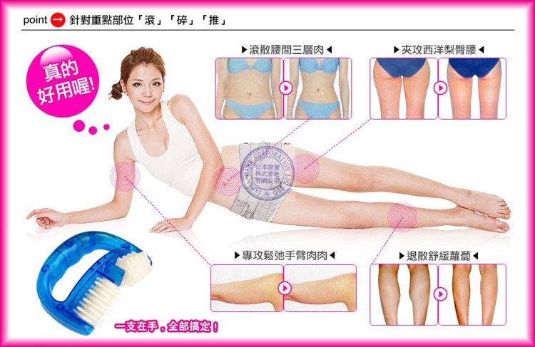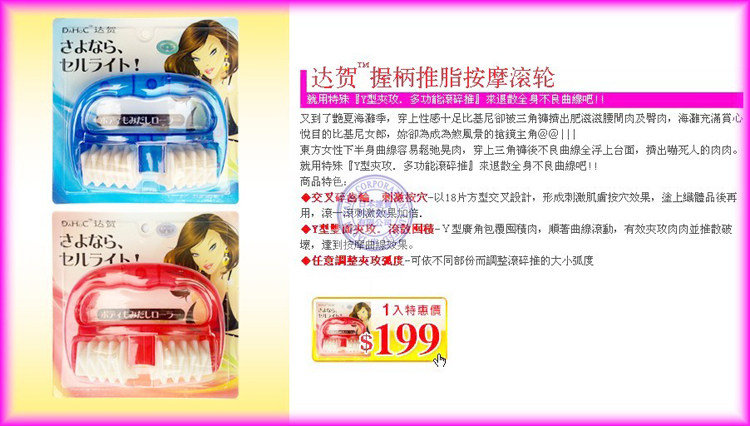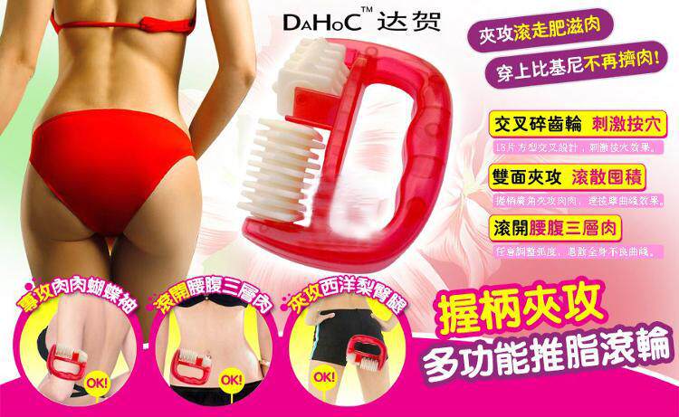 每日按摩握柄推脂刺激美体按摩滚轮」,全新的软式方型按摩滚轮设计,滚轮呈现微V型的角度设计,在滚动按摩的同时还可以拉紧肌肉唷!