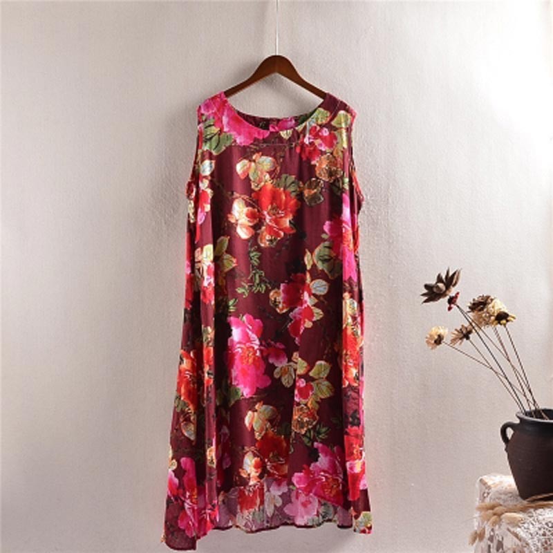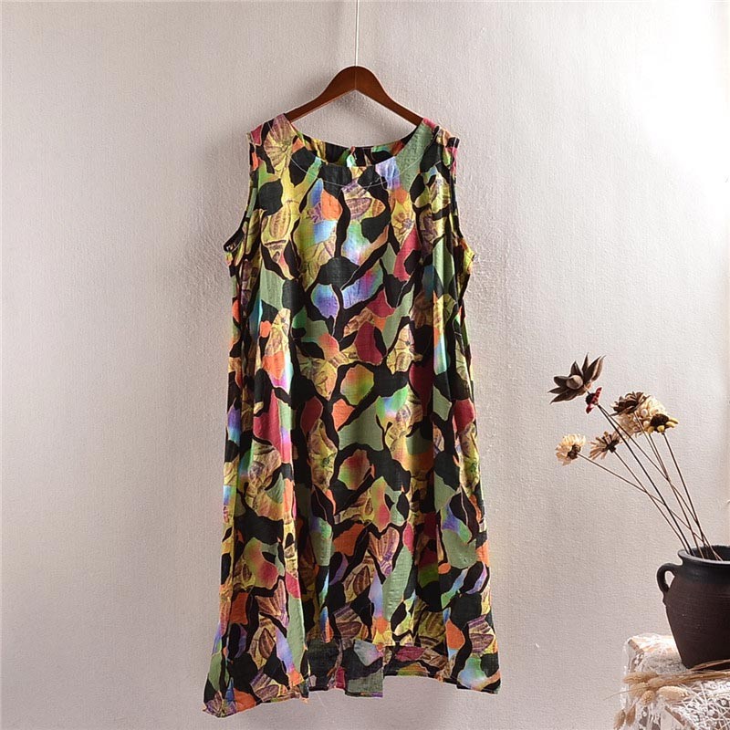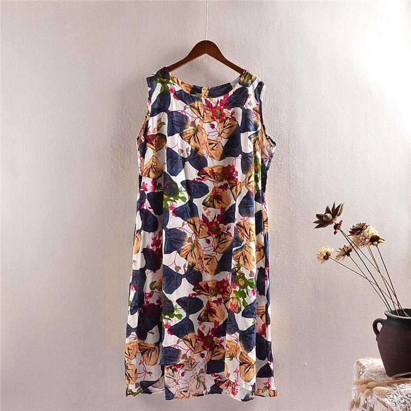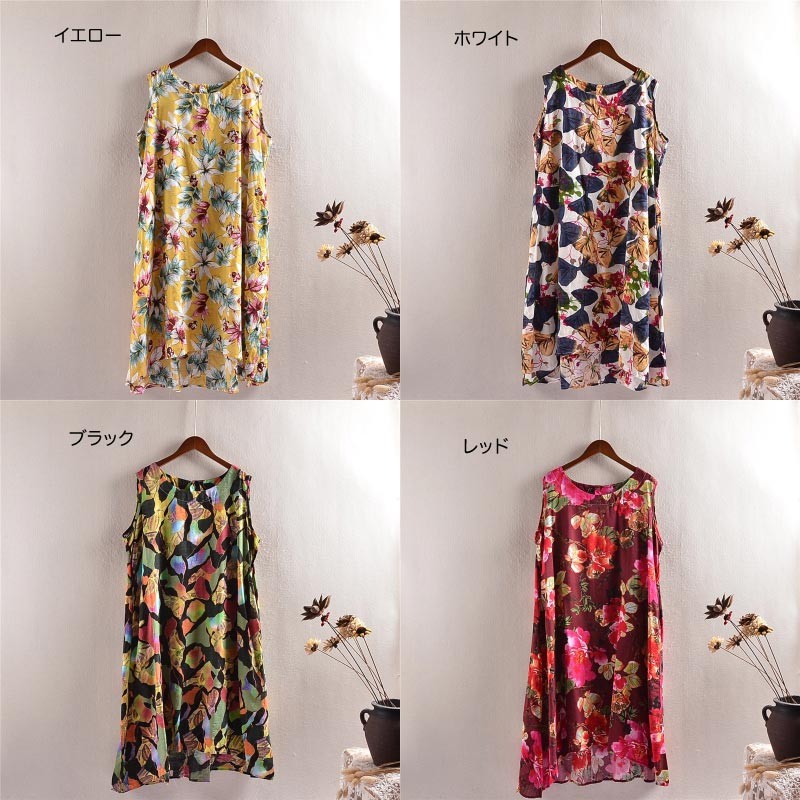 個性的なボタニカルプリント・ラウンドネック・ノースリーブのAラインワンピ♪