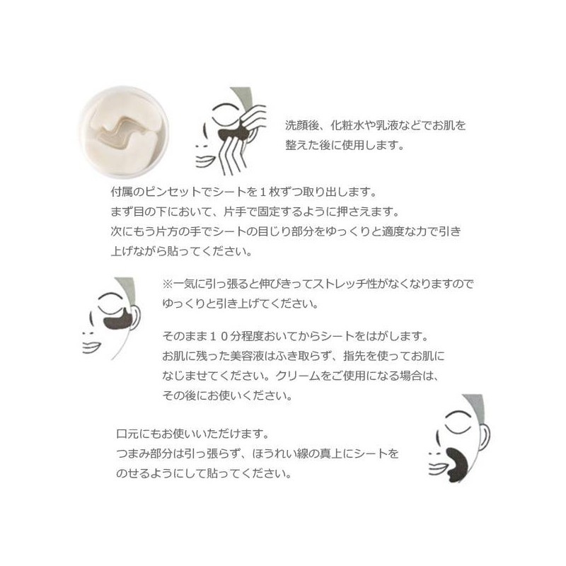 [How to use] When it comes to mind the condition of your skin, to measure your 2 times a week. It is possible to put it in the refrigerator chilled and enjoy. Use after conditioning your skin, lotion or moisturizer after washing your face. Remove the sheets one at a time with supplied tweezers First of all in the eyes with one hand to secure hold. Place: on the one hand Balinese pieces of sheet slowly with moderate force while pulling up. * Quickly pulled and stretched, eliminates the need to stretch, so please pull up slowly. Peel off the sheet and leave 10 minutes later. Amount remaining on your skin essence blends into your skin using your fingertips. When using this cream after that please.