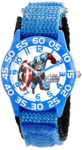 -. Binding : Watch -. Brand : Marvel -. Color : Blue -. Department : boys -. EAN : 0843231078765 -. Feature : Round Time Teacher Plastic Watch with Marvel's Captain America character on dial. / Meets or exceeds all US Govt requirements and regulations for Children's watches. / Recommended for Ages 3-7 years old. Includes a Time Teacher Punch Out clock for Parents to Teach their Children. / Accurate Japanese Quartz movement, scratch resistant mineral crystal, hook and loop Nylon strap / Water Resistant to 99 feet: withstands rain and splashes of water, but not showering or submersion. / 1 Year Limited Manufacturers Warranty -. Label : Marvel-Roll Up -. Manufacturer : Marvel-Roll Up -. Model : W001726 -. MPN : W001726 -. PackageQuantity : 1 -. PartNumber : W001726 -. ProductGroup : Watch -. ProductTypeName : WATCH -. Publisher : Marvel-Roll Up -. Studio : Marvel-Roll Up -. Title : Marvel Kids' W001726 Captain America Analog Display Analog Quartz Blue Watch -. UPC : 843231078765