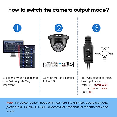 -. Feature : 2MP FULL HD 1080P 4-IN-1 SECURITY CAMERA - This 4-in-1 TVI/CVI/AHD/CVBS Dome Camera. compatible with HD-TVI, AHD, CVI, and CVBS/960H analog DVRs. / 65FT NIGHT VISION - Built in 24pcs IR LEDs, IR 65ft/20m night vision,1920TVL ,3.6mm lens with IR CUT provide clear images, even in the dark. / INDOOR AND OUTDOOR USE - Camera used high quality plastic materials, can effectively prevent rust, can be installed in almost any outdoor or indoor place. / 4 MODE VIDEO OUTPUT - 1080P AHD, 1080P CVI, 1080P TVI and CVBS .Default Video mode is 960H mode, compatible with all analog DVRs. 1080P video mode must be switched according to your 1080P DVR type. Widely Usage: With OSD button, you can change signal mode freely and quickly in 5 seconds / NOTED&WARRANTY - This camera did not come with DVR, power supply &video power cable! One year quality warranty,Lifetime Tech Support.