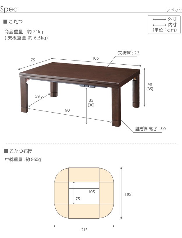 幅105x奥行75x高さ35/40cm(継脚5cm)