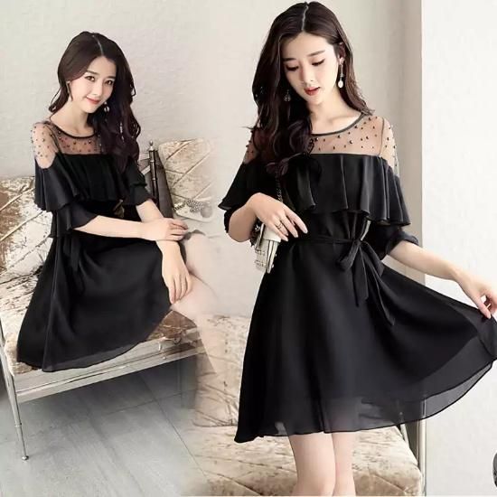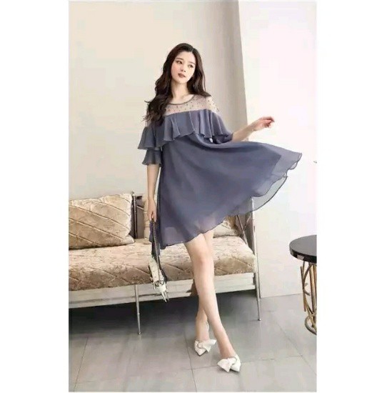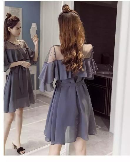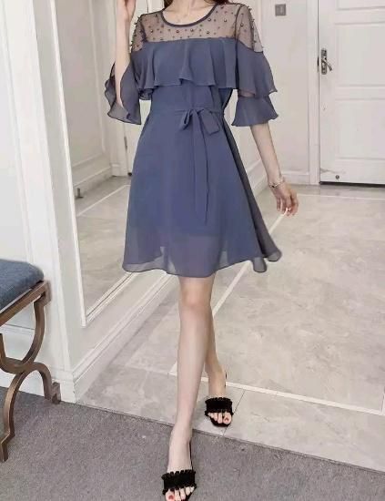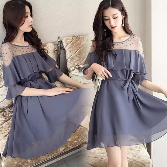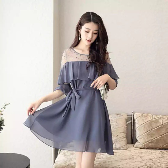 デコルテラインにパールが付いた、ミニ丈シフォンワンピース。