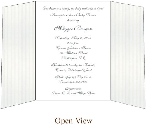 Product Description Baby Shower Invitations: This beautiful invitation features a white card that is wrapped by a tri-fold vellum with faint, beige vertical stripes. It is elegantly finished w 0