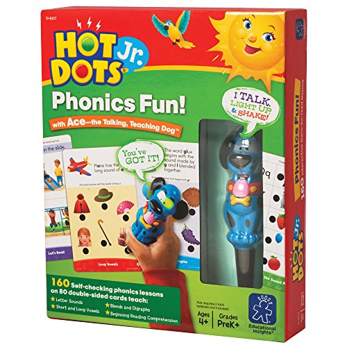 -. Feature : Add some fun to phonics practice with this colorful, interactive Hot Dots Jr. set and Ace - the Talking, Teaching Dog pen. / 160 Richly illustrated phonics lessons cover the alphabet, letter sounds, long and short vowels, beginning reading comprehension, and more! / Press Ace to an answer dot-he offers affirmative "ruffs" and encouraging words for correct responses, and gentle redirection for incorrect responses. / Helps develop critical early learning skills, and provides confidence-building feedback. Encourages self-paced independent learning. / Lesson cards cover the sound alphabet, long and short vowels, digraphs, blends, and more!