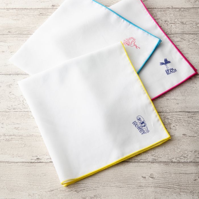 심플한 베이스 컬러로,네온 컬러의 멜로우와 캐치인 원 포인트 디자인이 매우 귀여운 손수건.