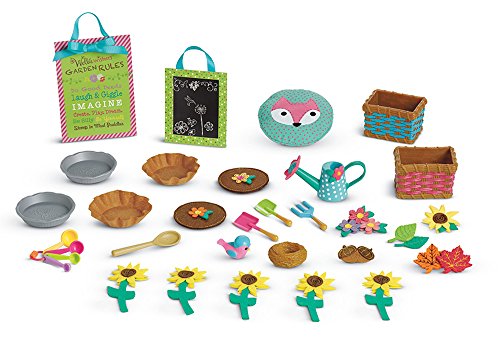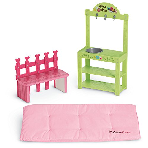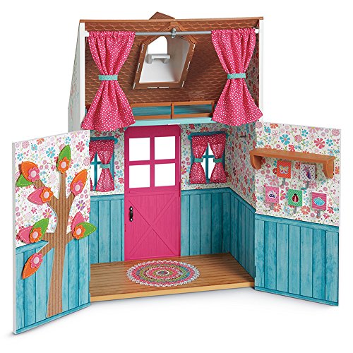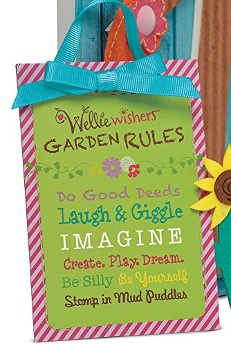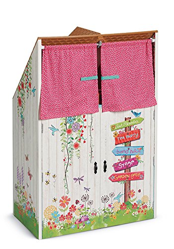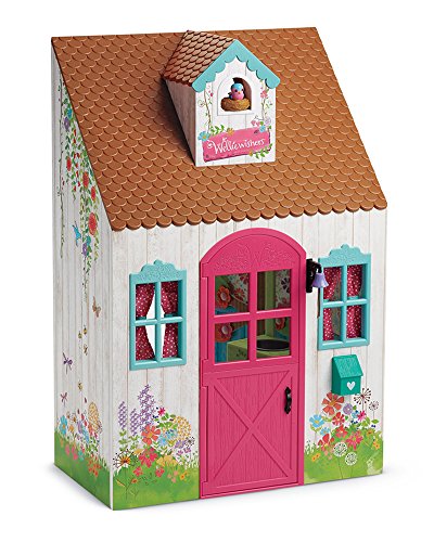 This beautiful wooden playhouse is the welliewishers' favorite place to play make-believe. The front has a Dutch door, curtains on windows that open and close, a mailbox, and a pull-string to ring the doorbell. Up above, the loft is perfect for afternoon naps. It has a curtain to close when sleepyheads need rest, and there's even a little bird and nest that sit in the window. The set comes with 33 pieces, including: a pink bench, a mud kitchen with supplies for pretend mud pies-two Pie tins, a ladle, and measuring spoons, felt fillings and toppings for the pretend mud pies: flowers, tree leaves, acorns, a sunflower, green leaves, two Pie crusts, and two Pie toppings. Gardening tools: a shovel, a spade, a rake, and a watering can, a mattress and pillow for the nap loft, two baskets and a bundle of sunflowers, a poster and a playhouse sign. W: 18" x H: 27" x D: 10" (us); W: 45.7 cm x H: 68.6 cm x D: 25.4 cm (metric).Feature