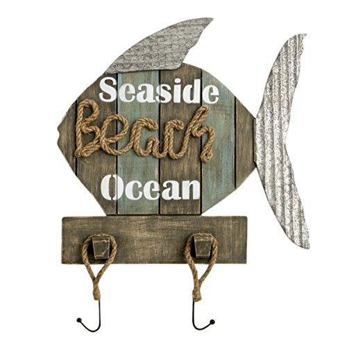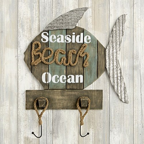 Distressed-Look Wooden Fish Seaside Beach Ocean Wall Sign with Coat Hooks, 18 Inch