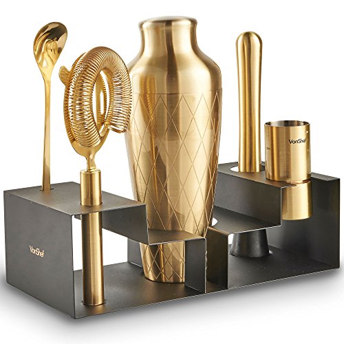 VonShef 7pc Gold Etched Cocktail Set Stand Give professional bartenders a run for their money with the VonShef Parisian Cocktail Set with Stand. Packed with all the essentials you need to host your very own cocktail party, the set helps you create a variety of cocktails with ease and sophistication. Contemporary 19oz capacity Parisian Cocktail Shaker boasts an on-trend and extremely robust etched gold coated stainless steel body. Must-Have Accessories The set comprises: Stainless Steel Muddler Let's you crush hard ingredients with ease to unleash and infuse flavors for mouth-watering cocktails. Stainless Steel Bar Spoon/ Fork Twisted double-ended design featuring a spoon for stirring at one end and a fork to remove garnishes at the other. Stainless Steel Hawthorne Strainer Sits on top of the shaker - strains away ice and other unwanted ingredients i.e. pips and large bits of fruit. 0.5oz/ 1oz Shot Measuring Jigger Double-ended design - essential for getting alcohol and liquor quantities exactly right. Display Stand Keeps the shaker and accessories all in one place - looks fantastic on display. Gift Box Recipe Guide Supplied in a stylish gift box with a matching recipe guide to get you started - this set is a great present for a loved one or as a treat to yourself. Accessories Measure: ? Parisian Shaker: H9.5 X D3.5 inches; Capacity: 17oz user capacity - 19oz max fill ? Muddler: L8" X W1" ? Bar Spoon: L9" ? Strainer: L5.5" X W4.5" ? Jigger: D1.5" X H3"