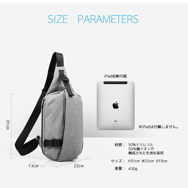 素材:ポリエステル、オックスフォード(50%テリレンと50%陽イオンで構成された生地を採用)